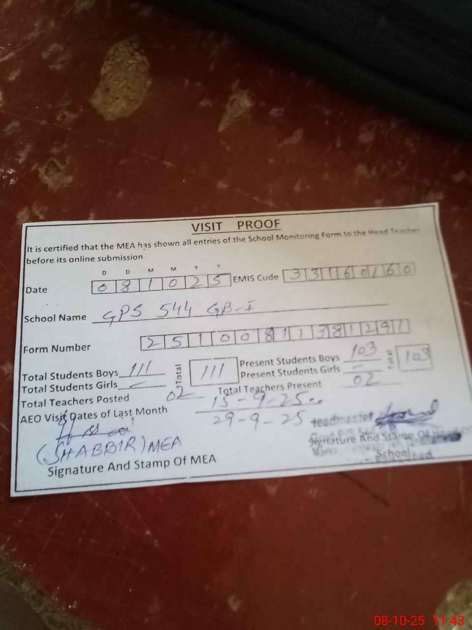 | Attendance Register | Head Teacher | MEA with School | Visit Proof |
