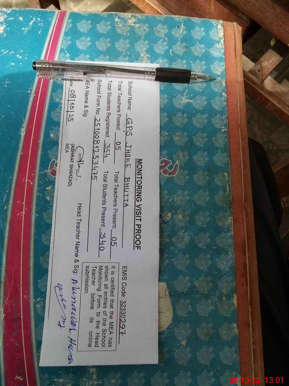 | Attendance Register | Head Teacher | MEA with School | Visit Proof |