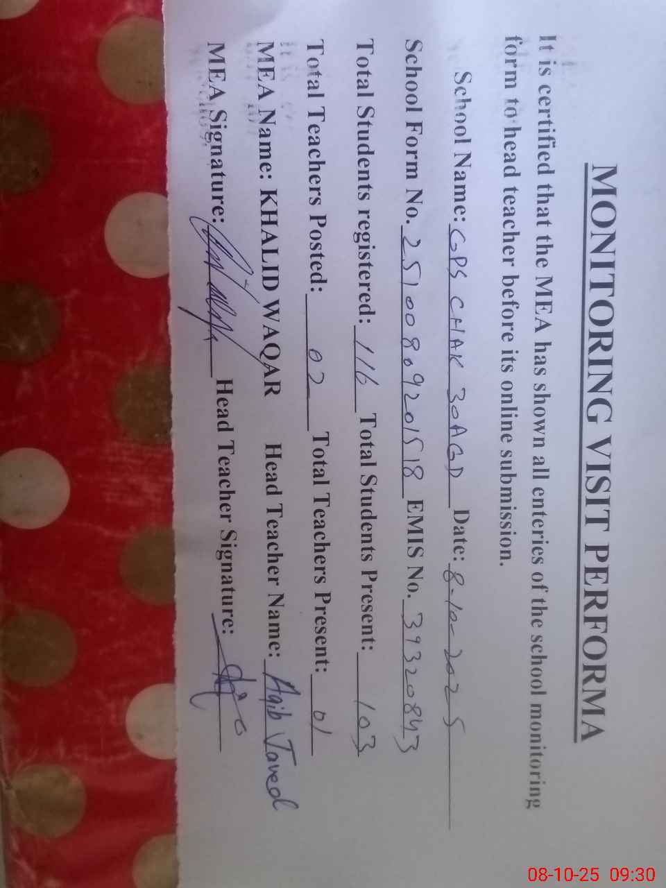 | Certified that this School was Inspected by the Undersigned MEA/DMO Today and the Information Stated Above is as Per Record. | |||||