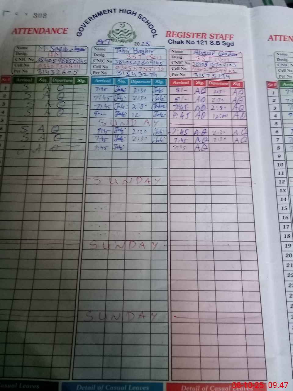| CNIC | Full Name | Designation | R/C | Absence during last cal. month |