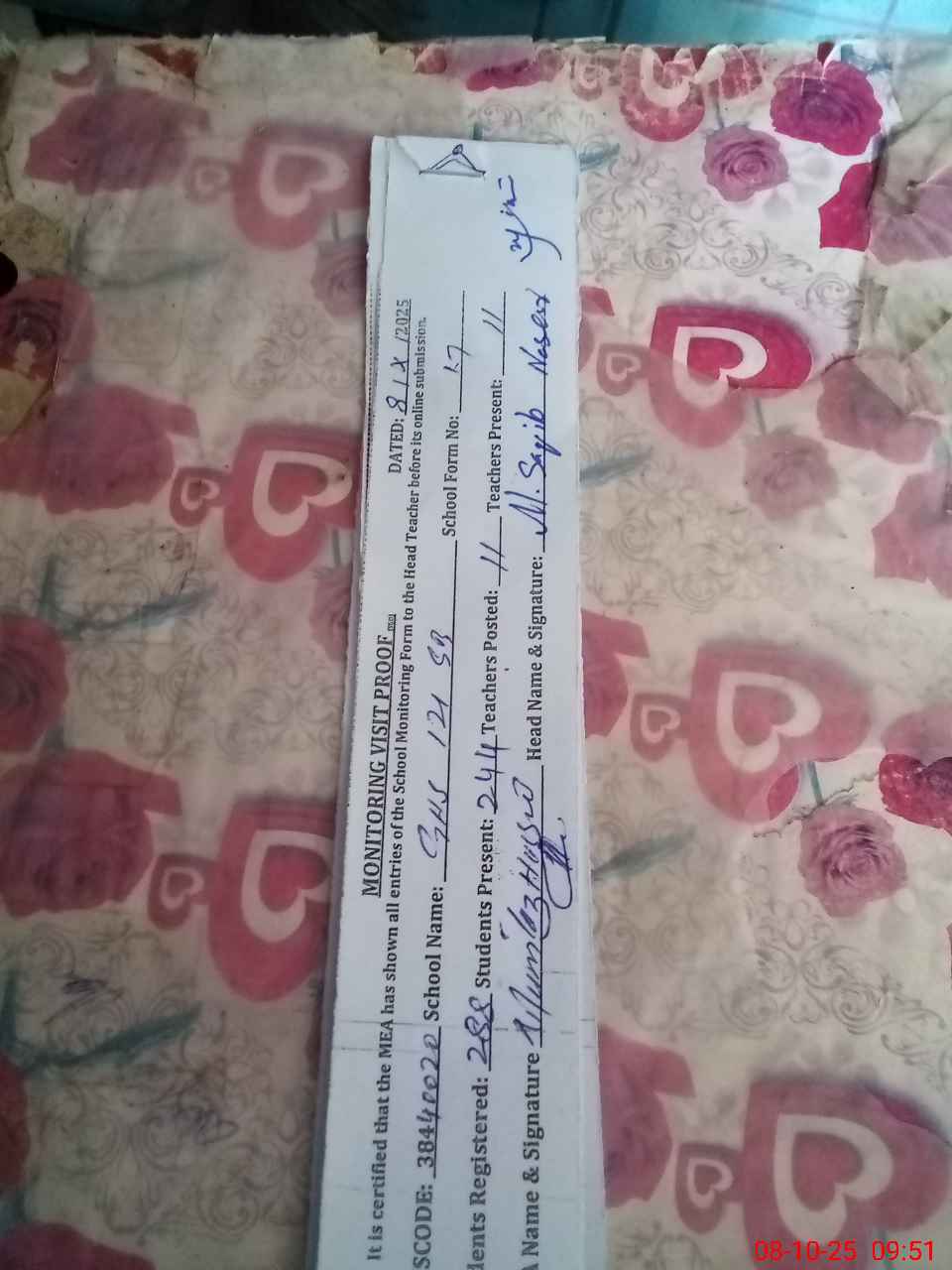 | Certified that this School was Inspected by the Undersigned MEA/DMO Today and the Information Stated Above is as Per Record. | |||||