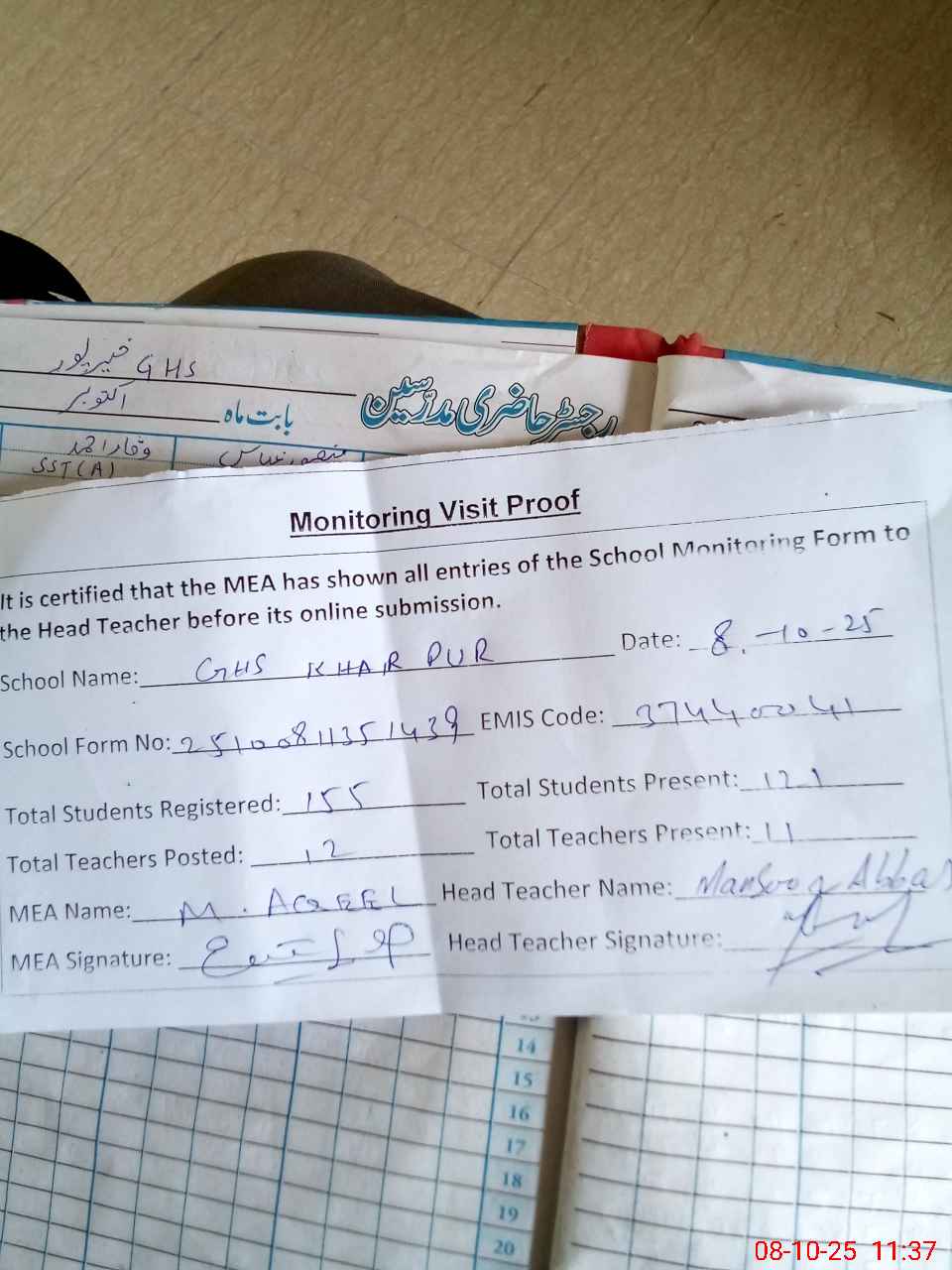 | Attendance Register | Head Teacher | MEA with School | Visit Proof |