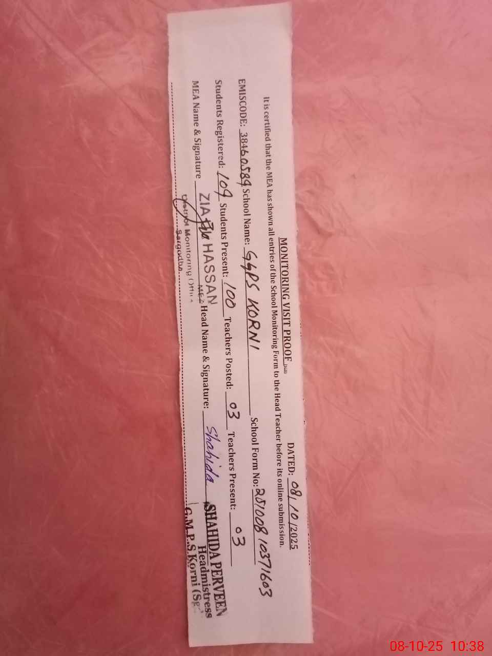 | Certified that this School was Inspected by the Undersigned MEA/DMO Today and the Information Stated Above is as Per Record. | |||||