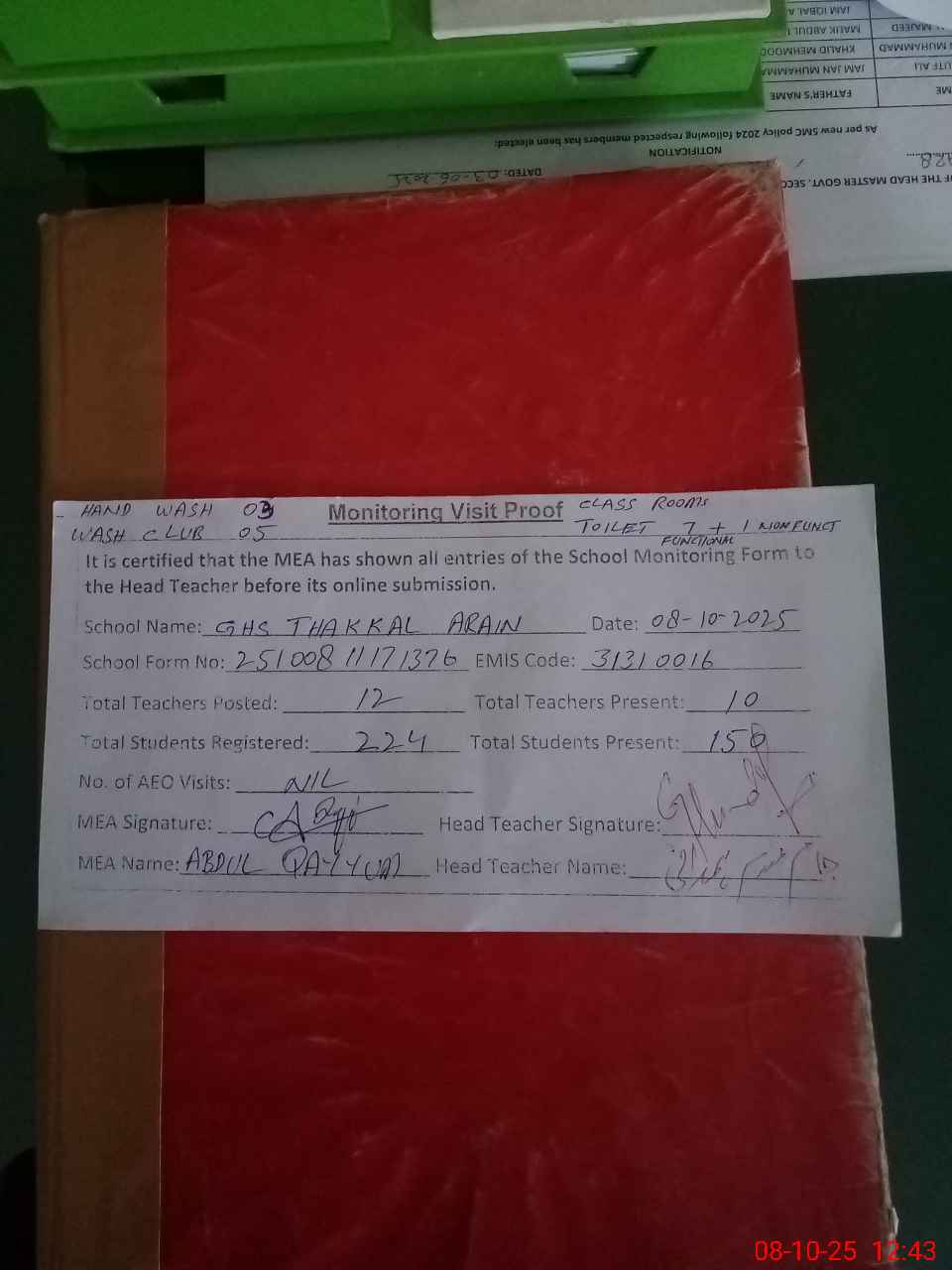 | Attendance Register | Head Teacher | MEA with School | Visit Proof |