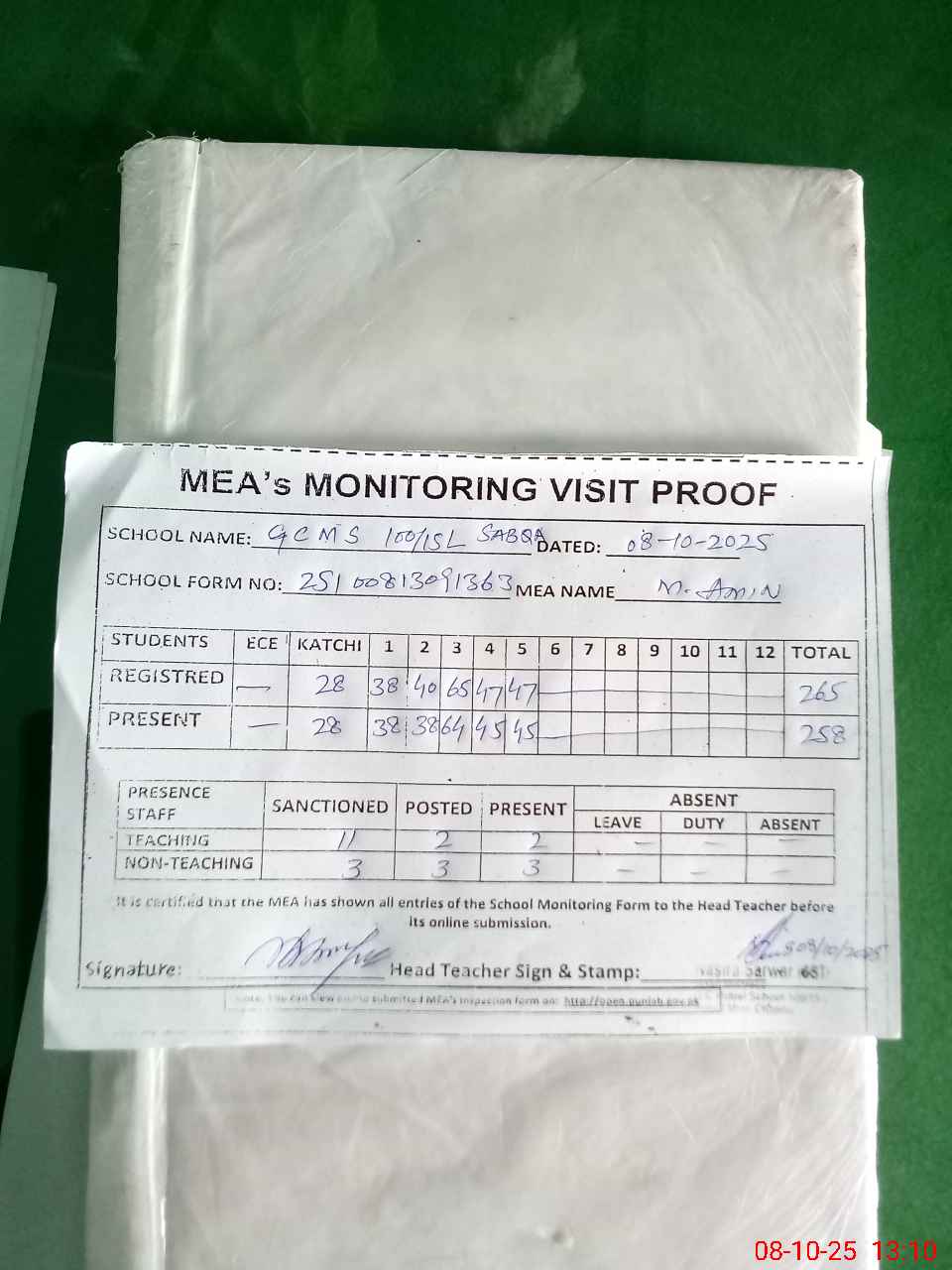 | EMIS Code: 36430296 | Name of School: GCMS 100/15-L SABQA, MIAN CHANNU | |||