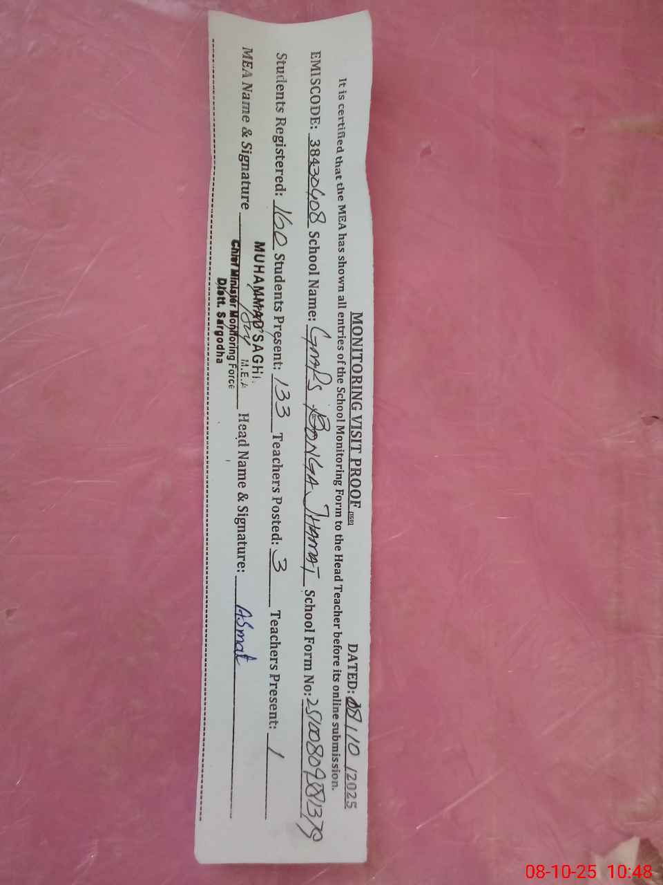 | Monitoring Date: 08-10-2025 | Start Time: 08-10-2025 09:58 AM | End Time: 08-10-2025 10:49 AM | Name of MEA: MU**** SA**** | |