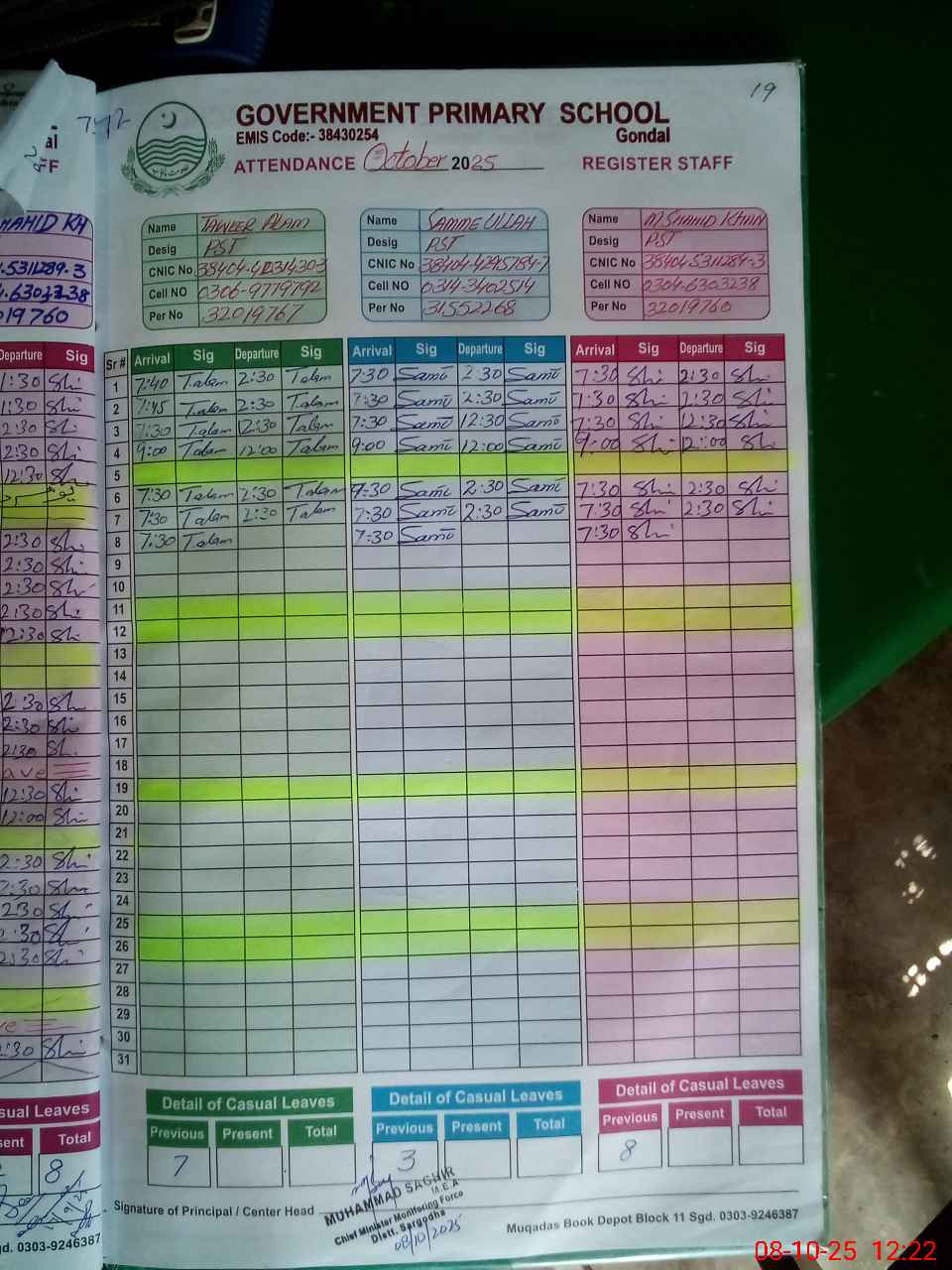 | CNIC | Full Name | Designation | R/C | Absence during last cal. month |