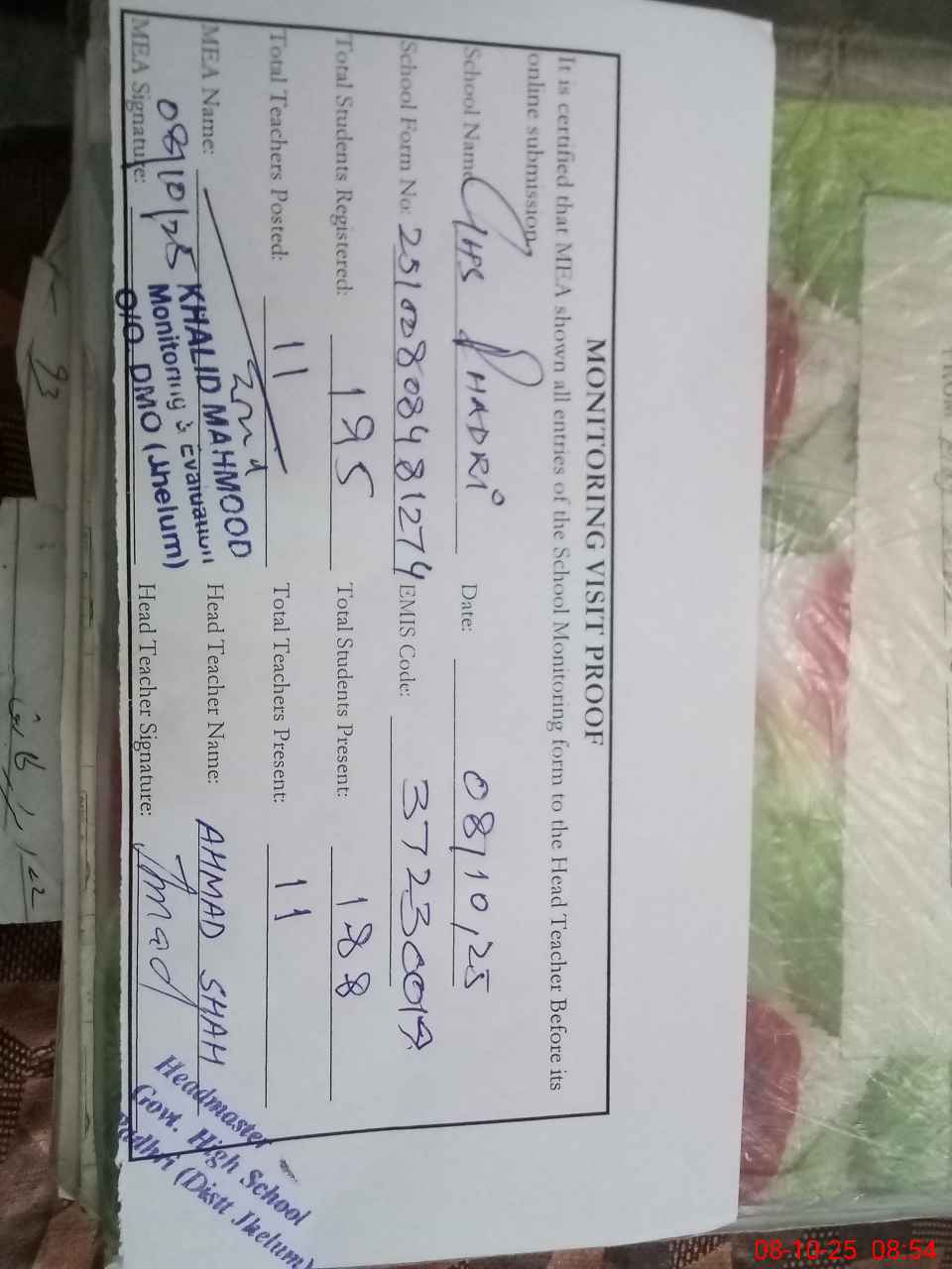 | Certified that this School was Inspected by the Undersigned MEA/DMO Today and the Information Stated Above is as Per Record. | |||||