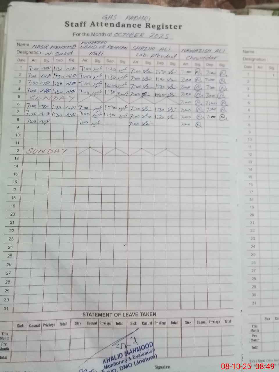 | CNIC | Full Name | Designation | R/C | Absence During Last Calender Month |