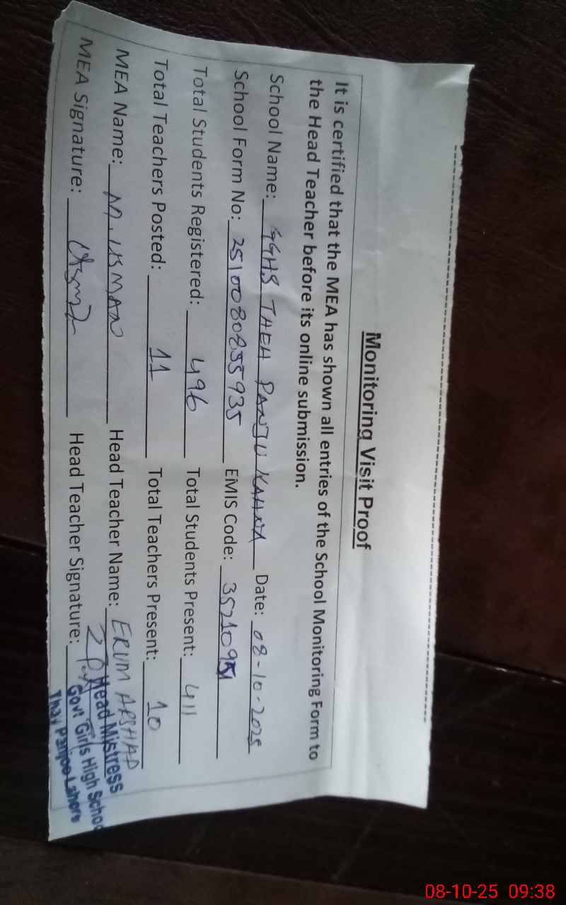 | Certified that this School was Inspected by the Undersigned MEA/DMO Today and the Information Stated Above is as Per Record. | |||||