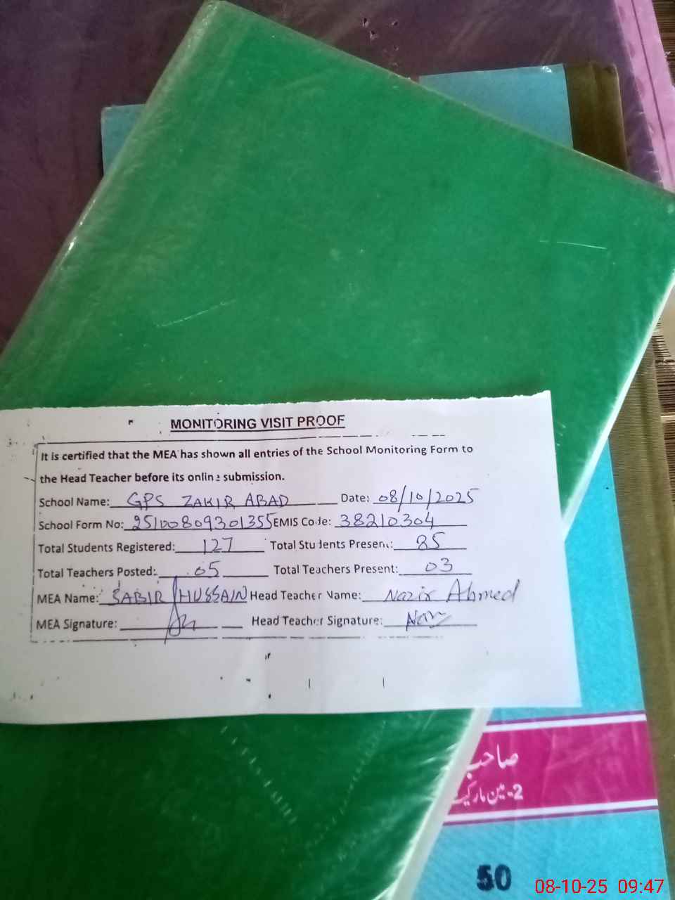 | Attendance Register | Head Teacher | MEA with School | Visit Proof |