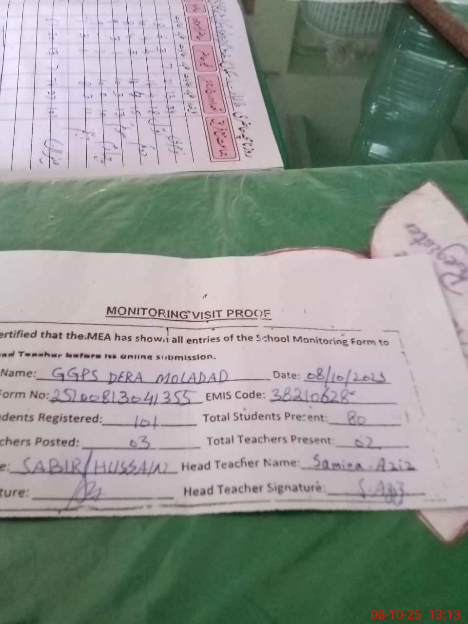 | Attendance Register | Head Teacher | MEA with School | Visit Proof |