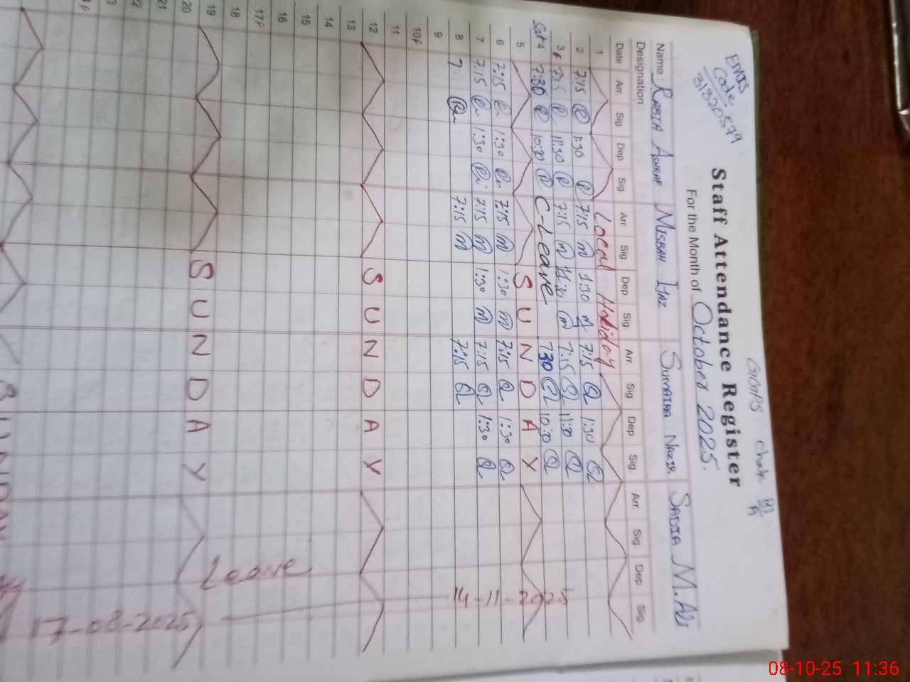 | CNIC | Full Name | Designation | R/C | Absence during last cal. month |