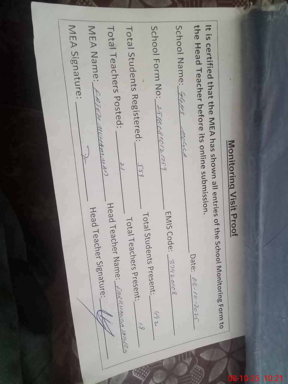 | Attendance Register | Head Teacher | MEA with School | Visit Proof |
