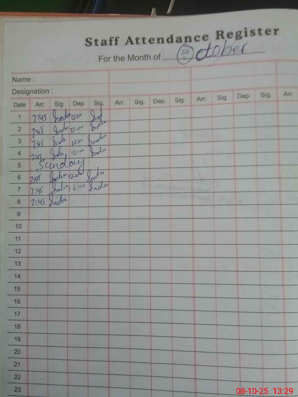 | CNIC | Full Name | Designation | R/C | Absence During Last Calender Month |