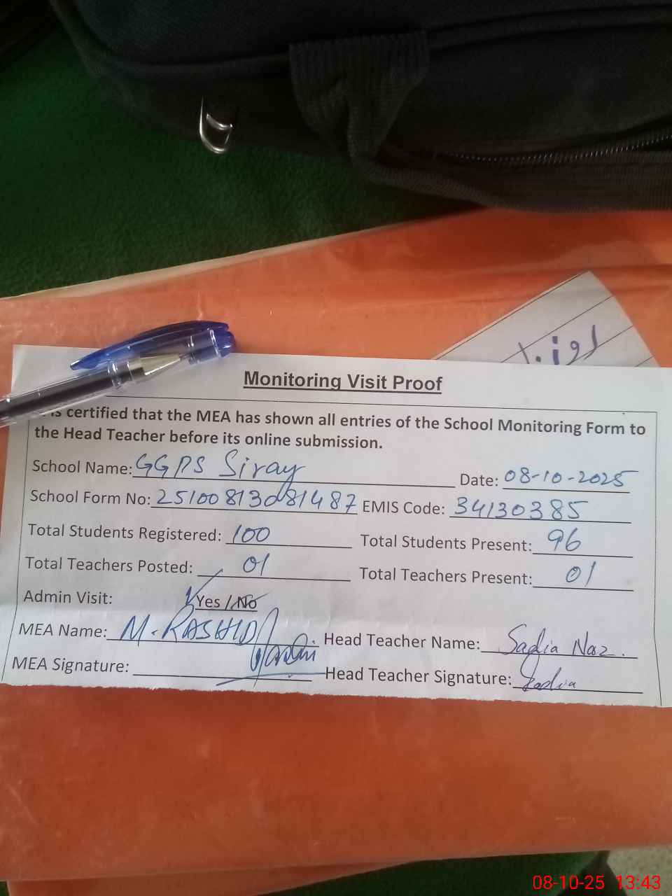 | Attendance Register | Head Teacher | MEA with School | Visit Proof |