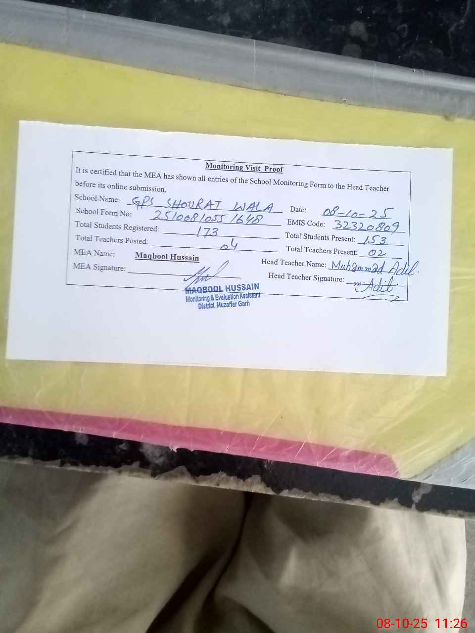 | EMIS Code: 32320809 | Name of School: GPS SHOHRAT WALA | |||
