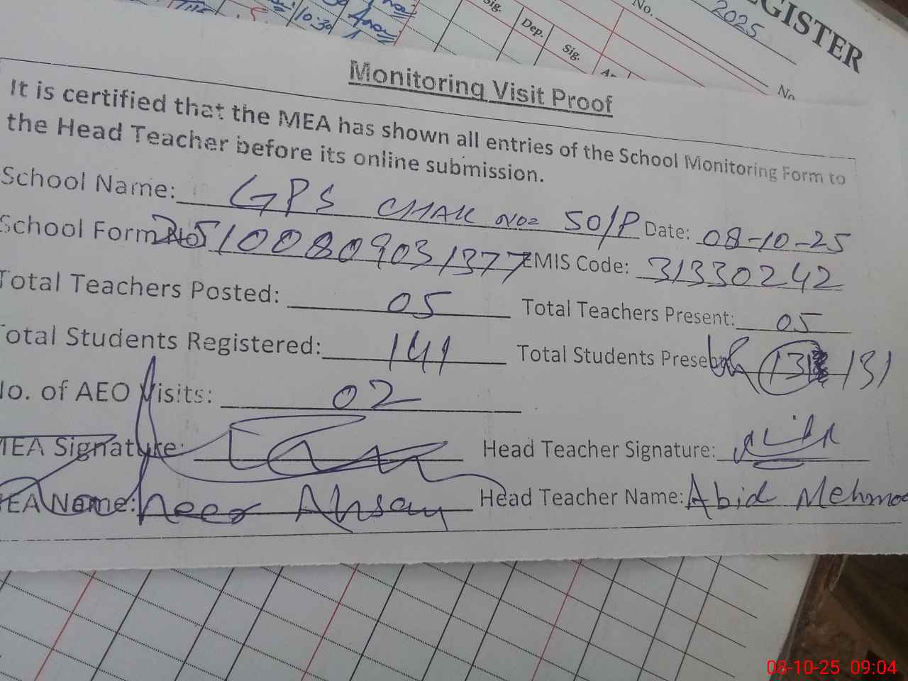 | Attendance Register | Head Teacher | MEA with School | Visit Proof |