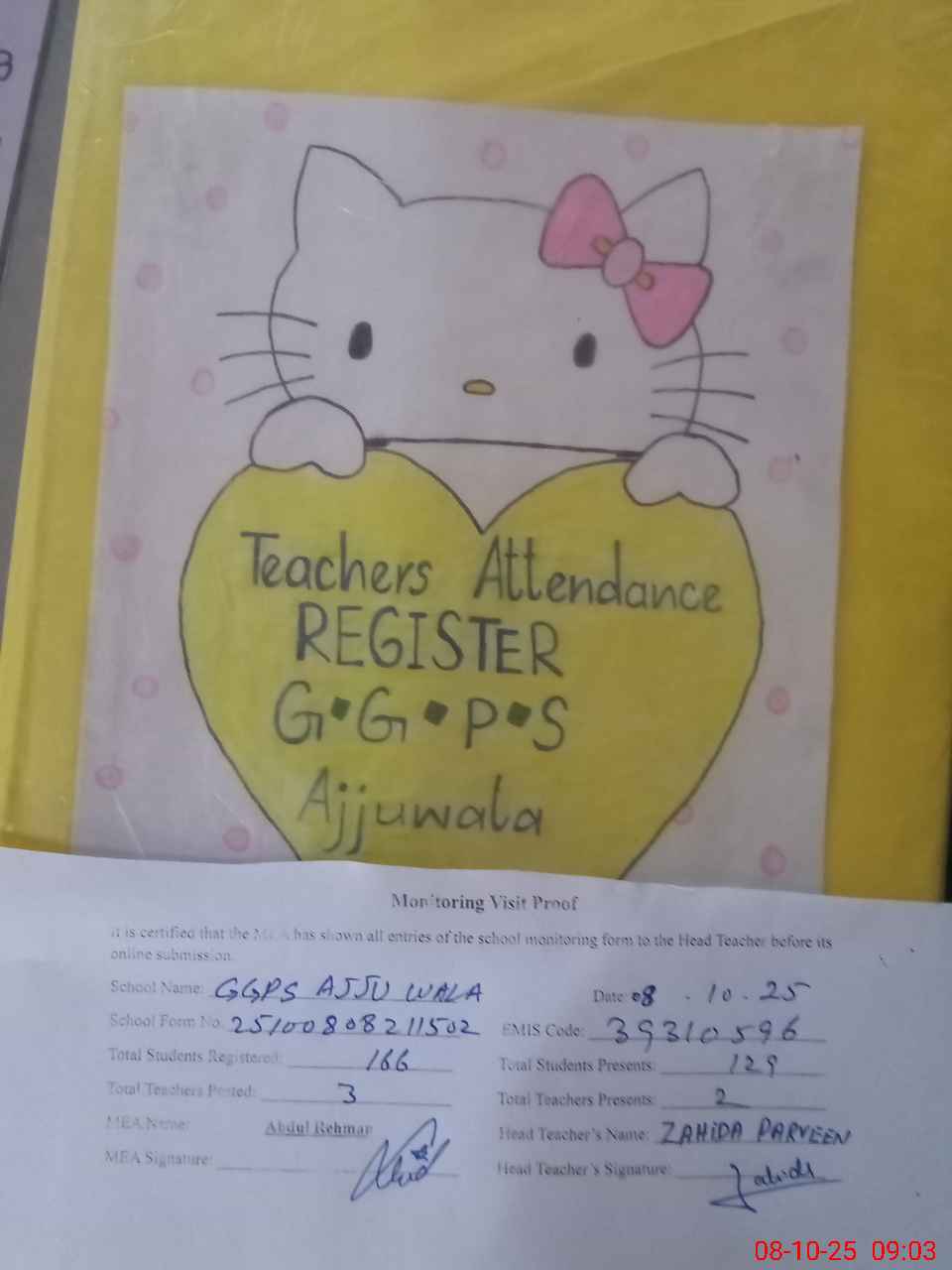 | Attendance Register | Head Teacher | MEA with School | Visit Proof |