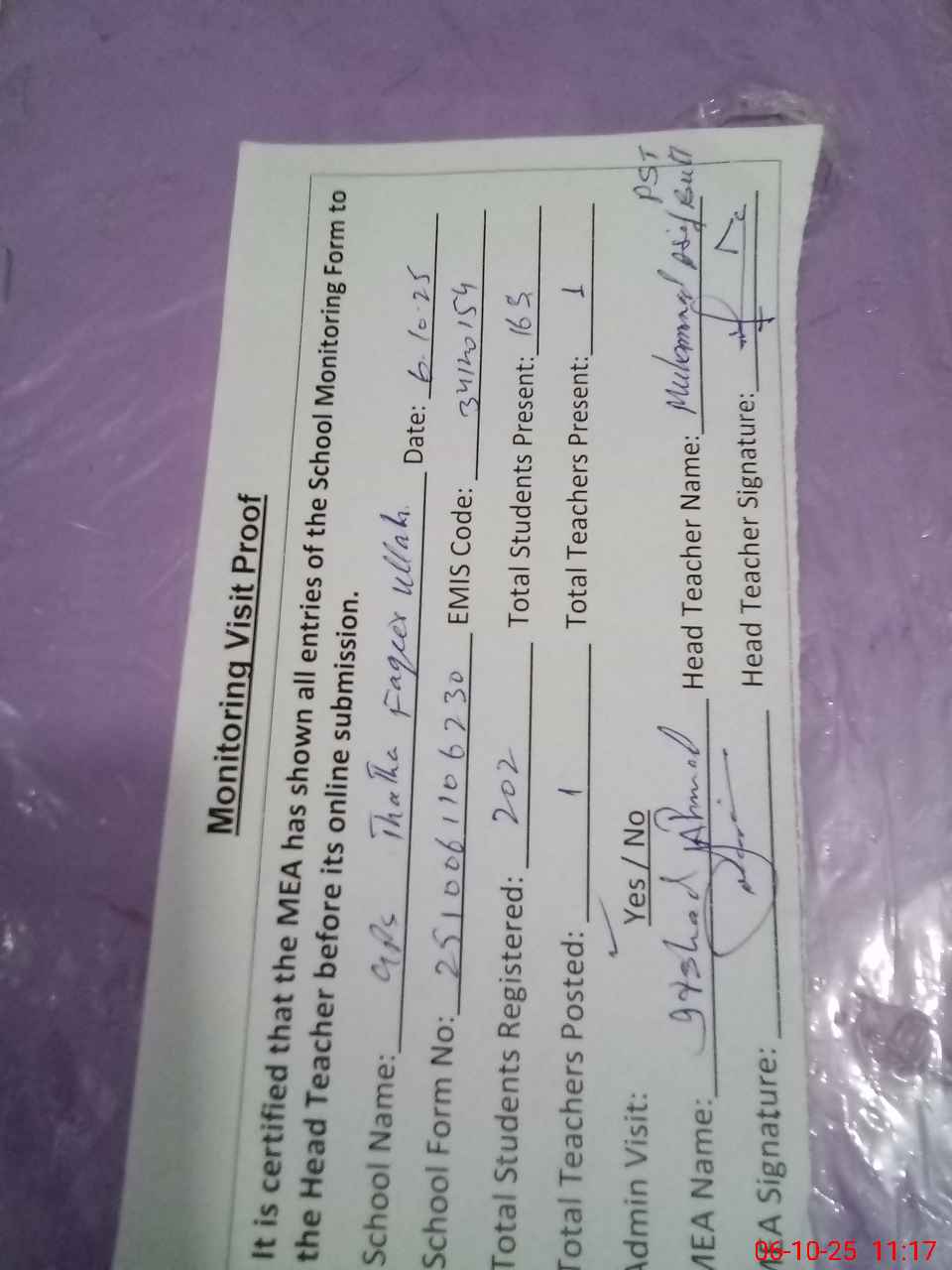 | Attendance Register | Head Teacher | MEA with School | Visit Proof |