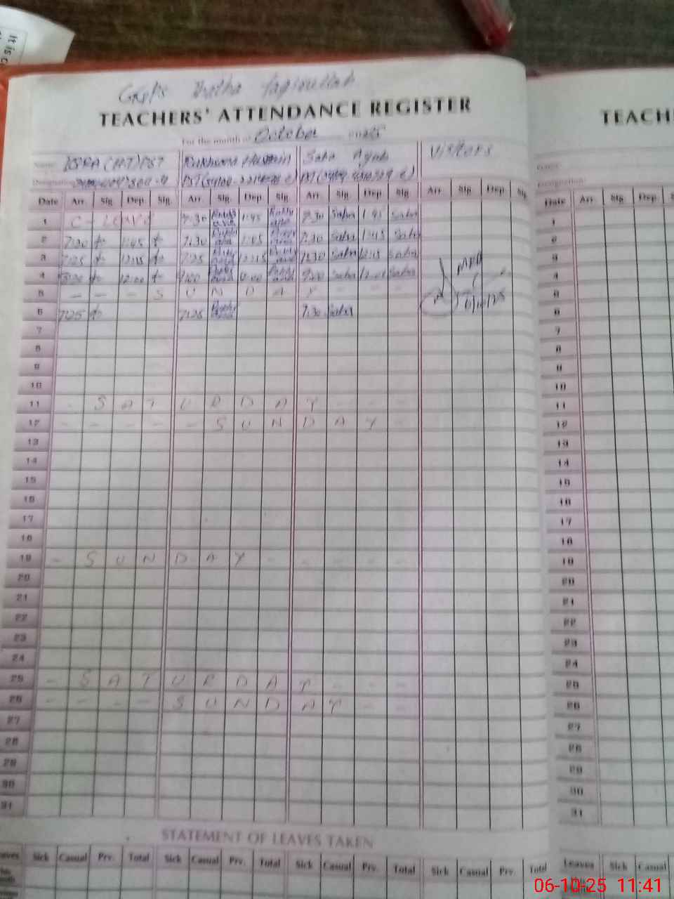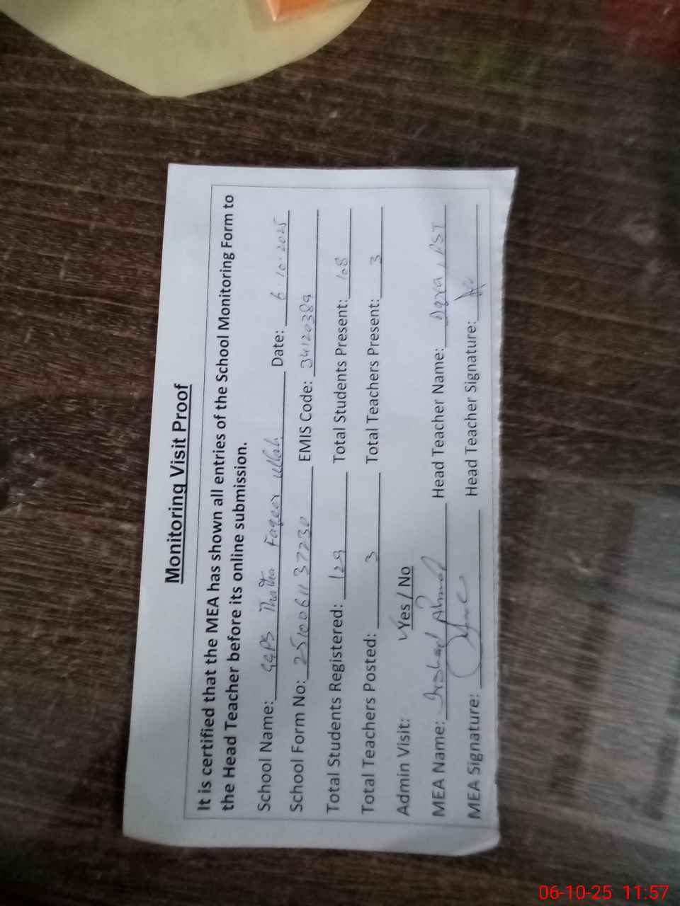| Attendance Register | Head Teacher | MEA with School | Visit Proof |
