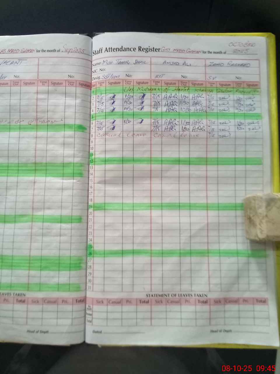 | CNIC | Full Name | Designation | R/C | Absence During Last Calender Month |