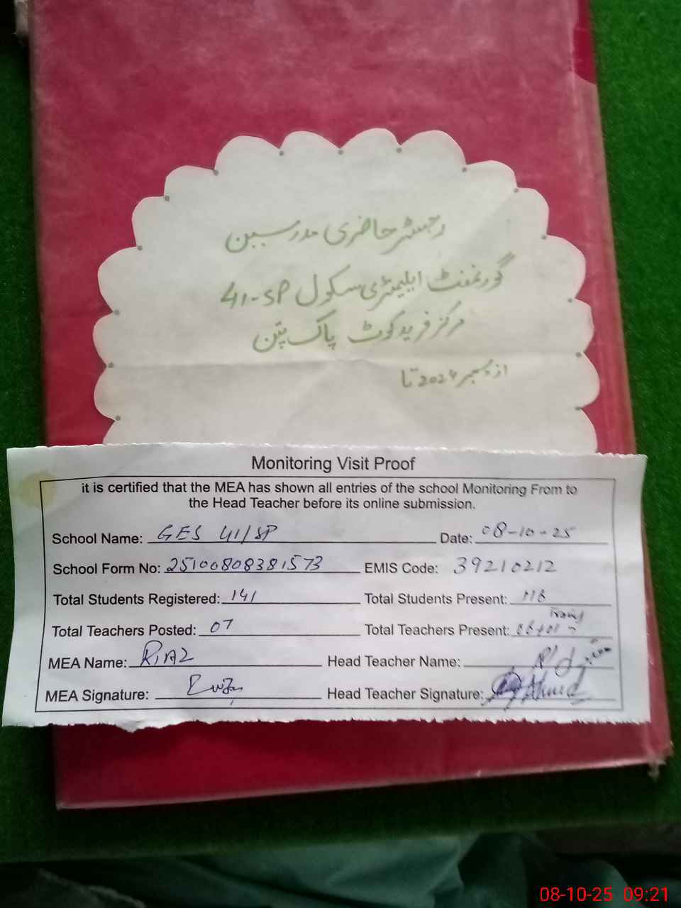 | Attendance Register | Head Teacher | MEA with School | Visit Proof |