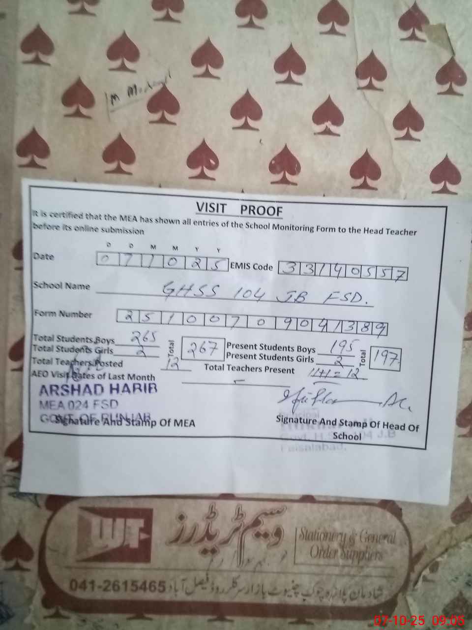 | Attendance Register | Head Teacher | MEA with School | Visit Proof |