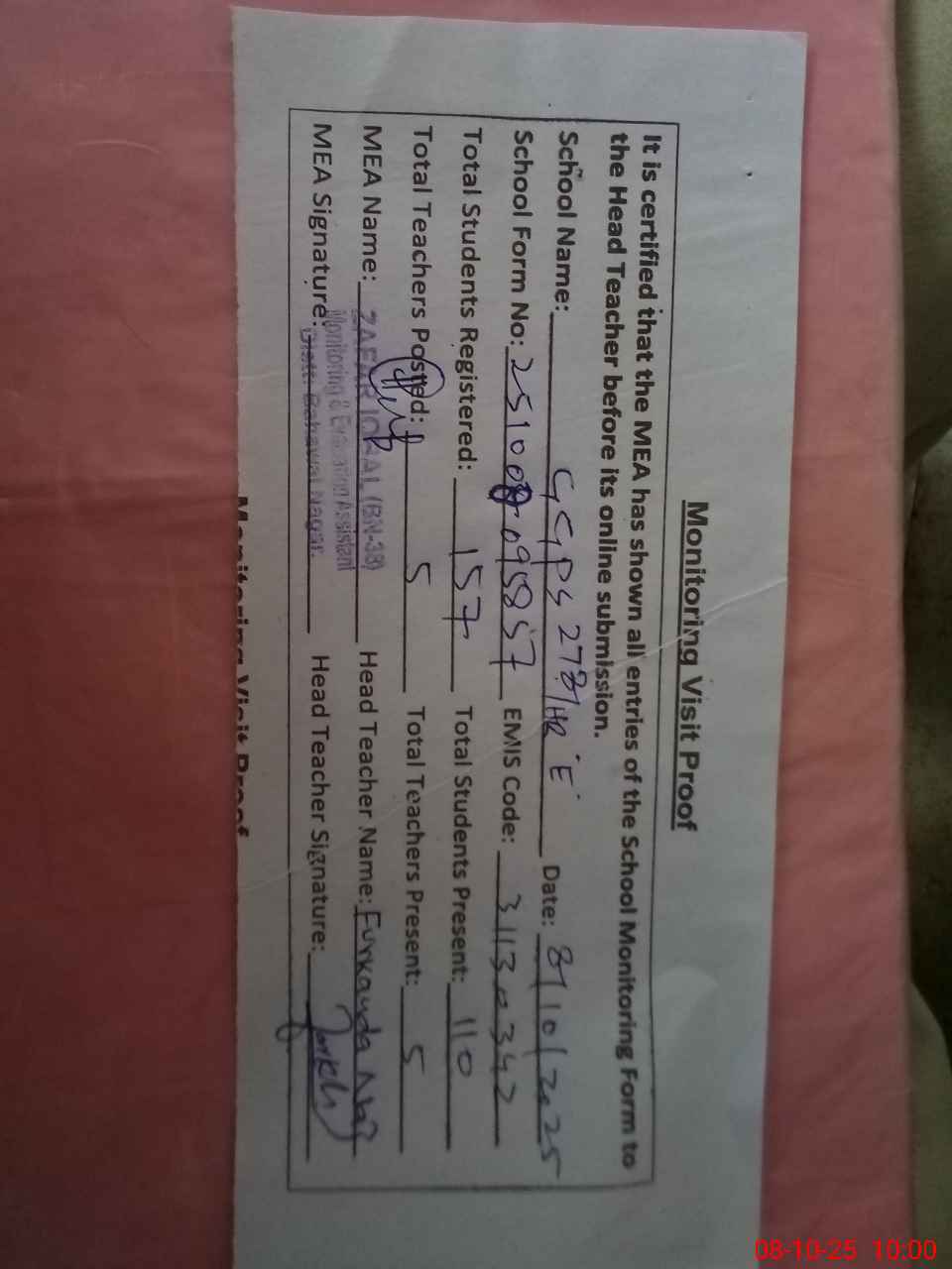 | Attendance Register | Head Teacher | MEA with School | Visit Proof |