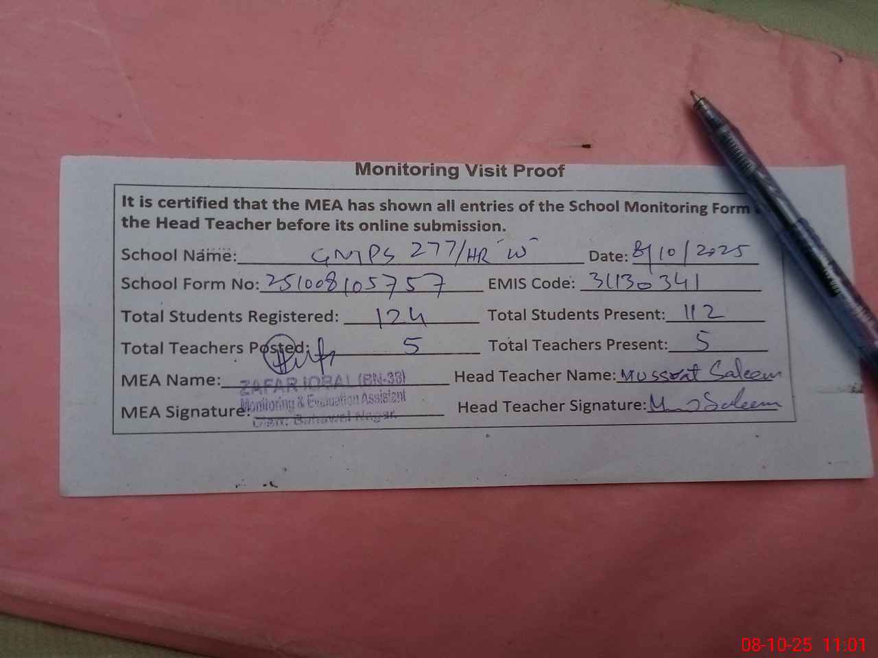| EMIS Code: 31130341 | Name of School: GMPS CHAK NO 277 HR W | |||