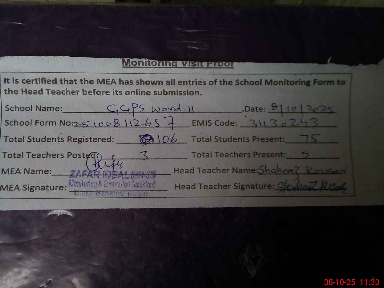 | Attendance Register | Head Teacher | MEA with School | Visit Proof |