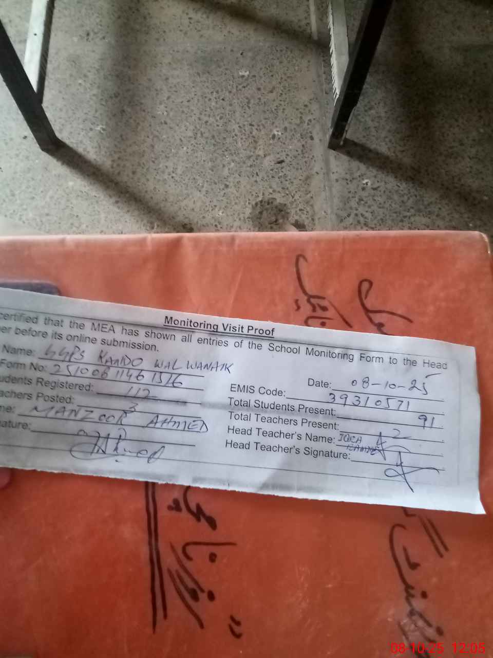 | Attendance Register | Head Teacher | MEA with School | Visit Proof |