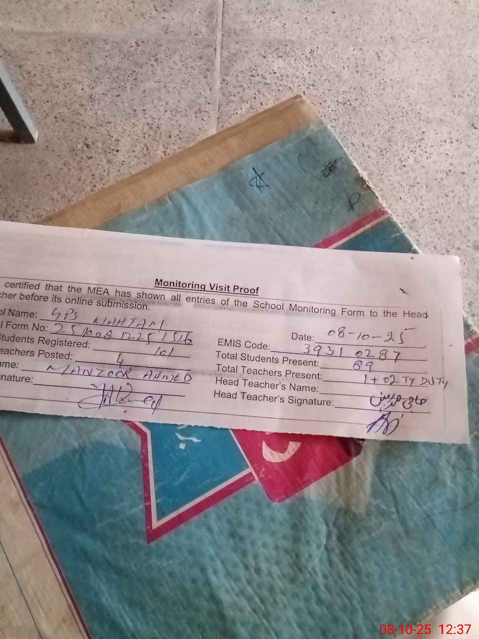 | Attendance Register | Head Teacher | MEA with School | Visit Proof |