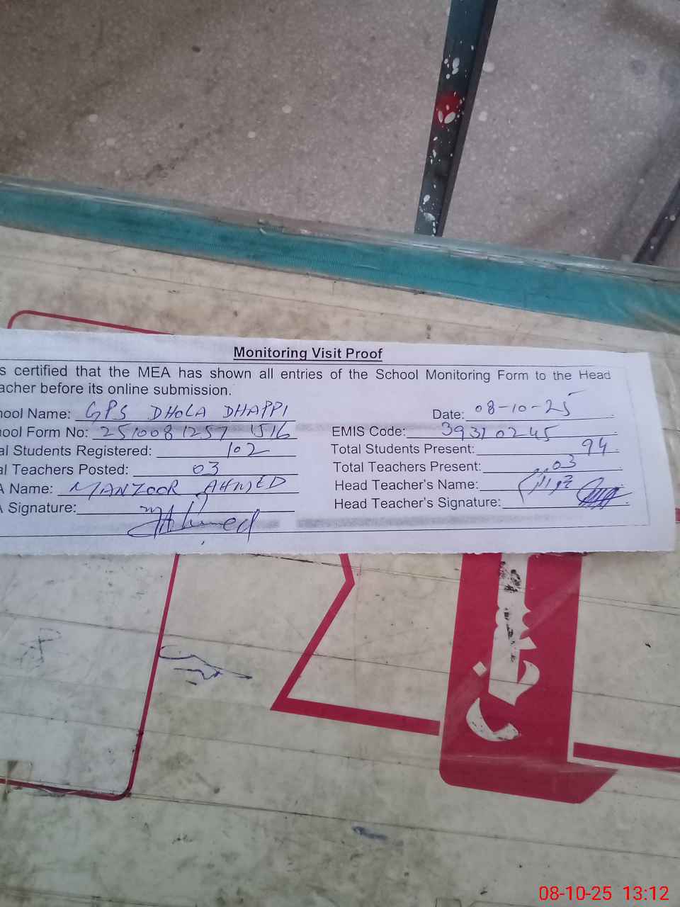| Attendance Register | Head Teacher | MEA with School | Visit Proof |
