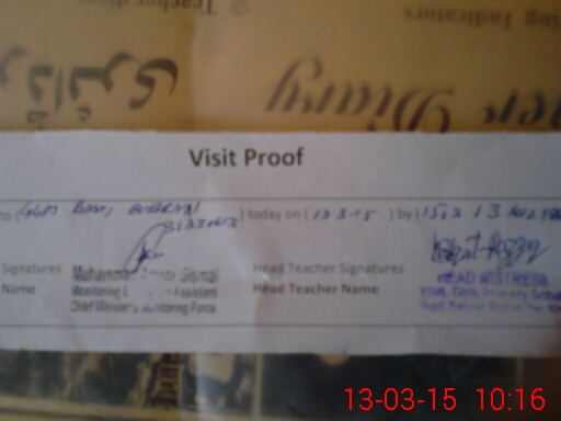 | School Visited by School Health & Nutrition Supervisor (No. of Visits) | 1 | Name1: | SAIF UR REHMAN | Name2: | |