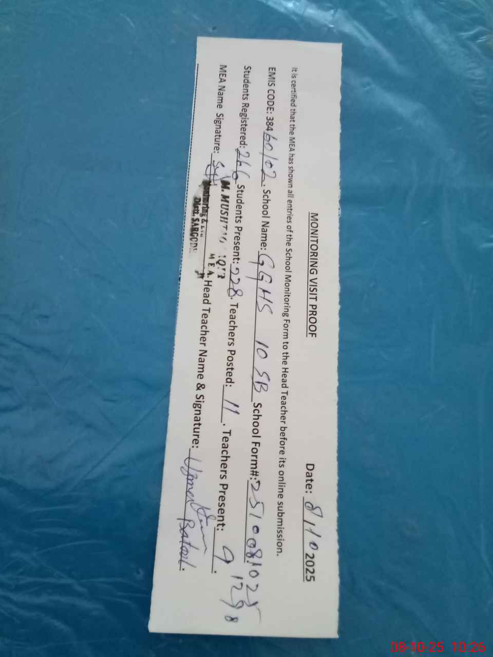 | Attendance Register | Head Teacher | MEA with School | Visit Proof |