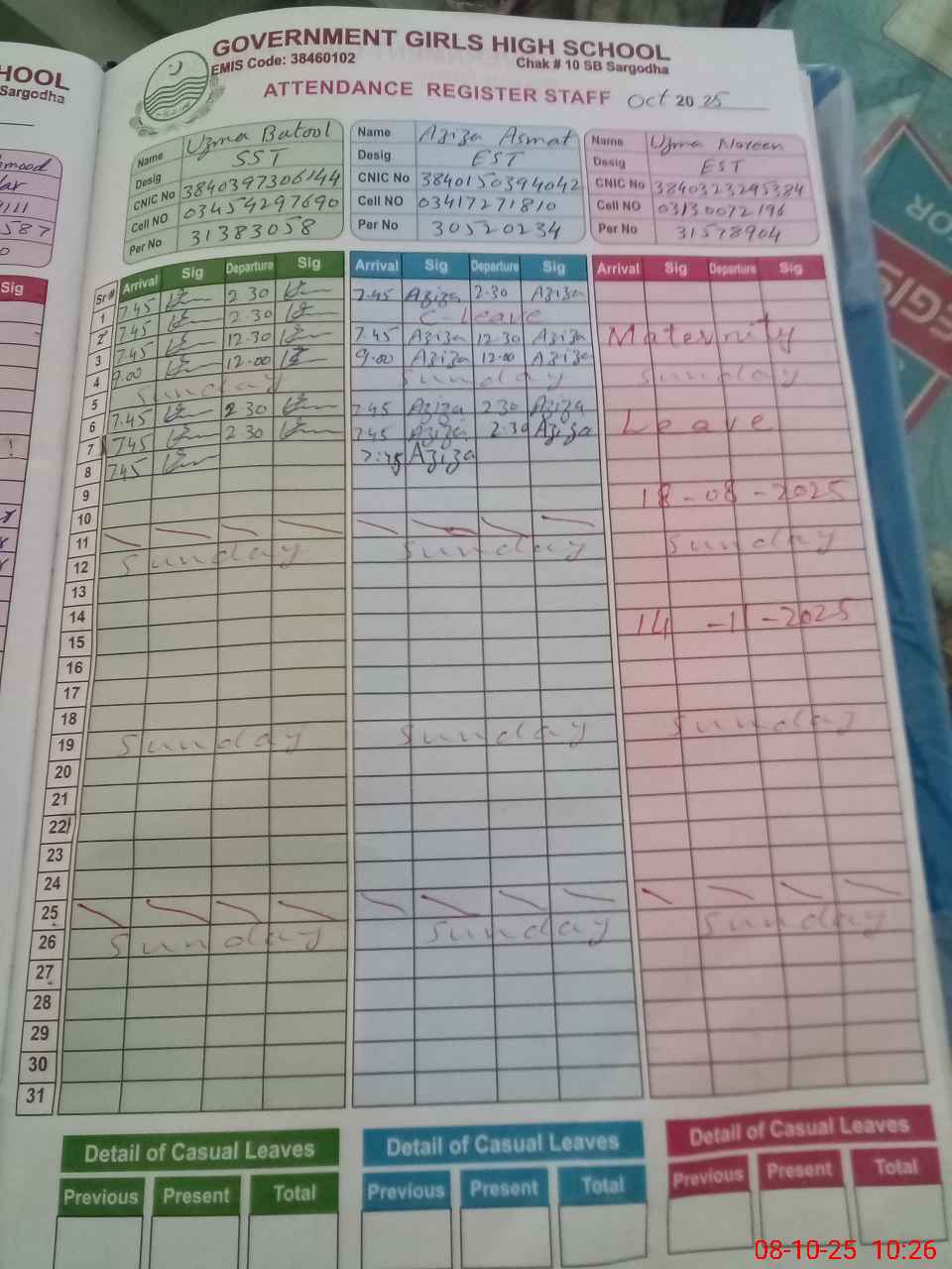 | CNIC | Full Name | Designation | R/C | Absence during last cal. month |