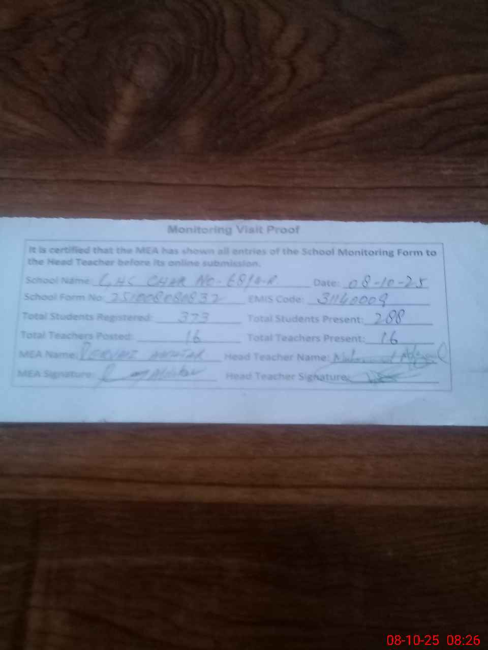 | Attendance Register | Head Teacher | MEA with School | Visit Proof |