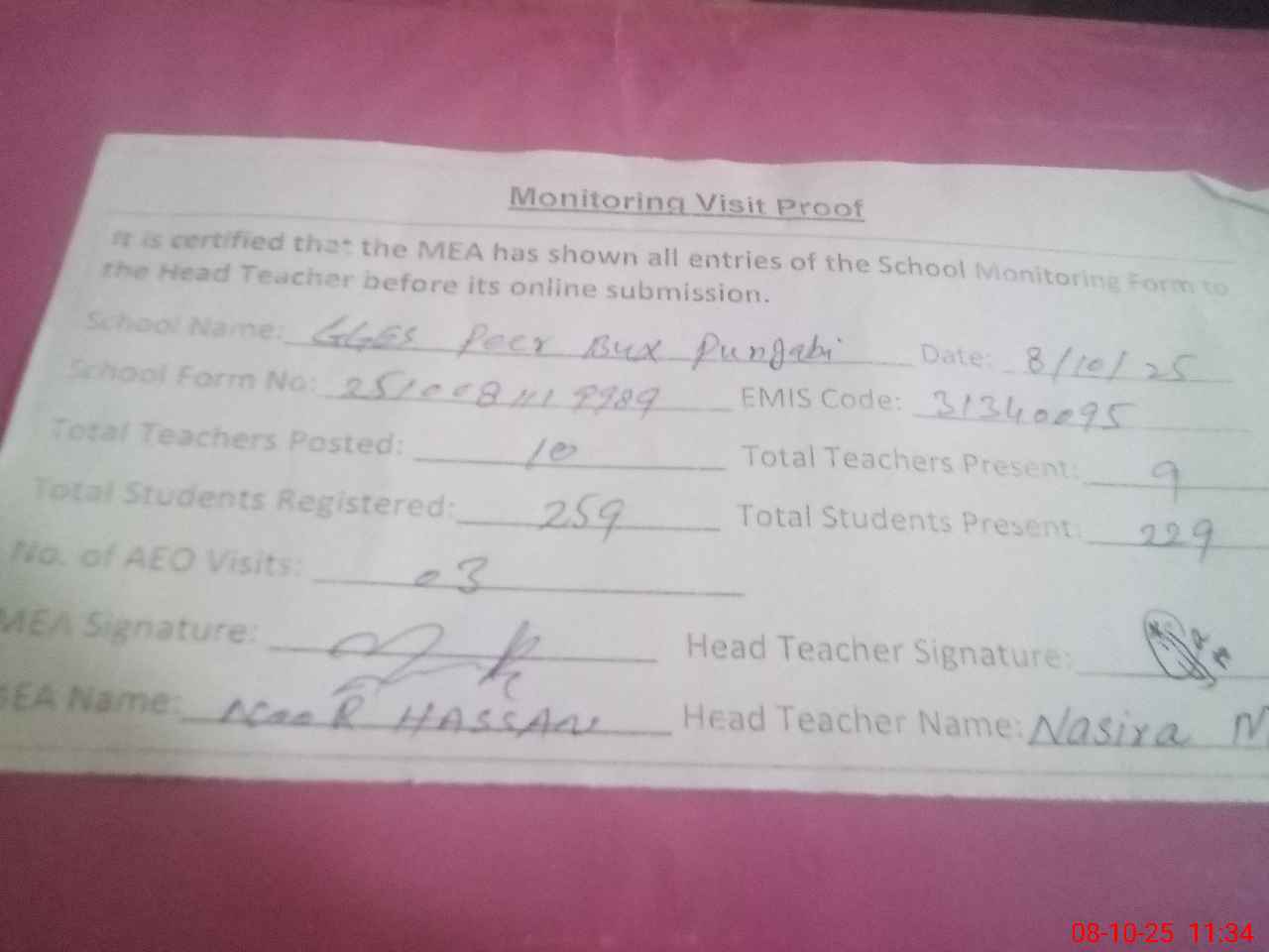 | Attendance Register | Head Teacher | MEA with School | Visit Proof |