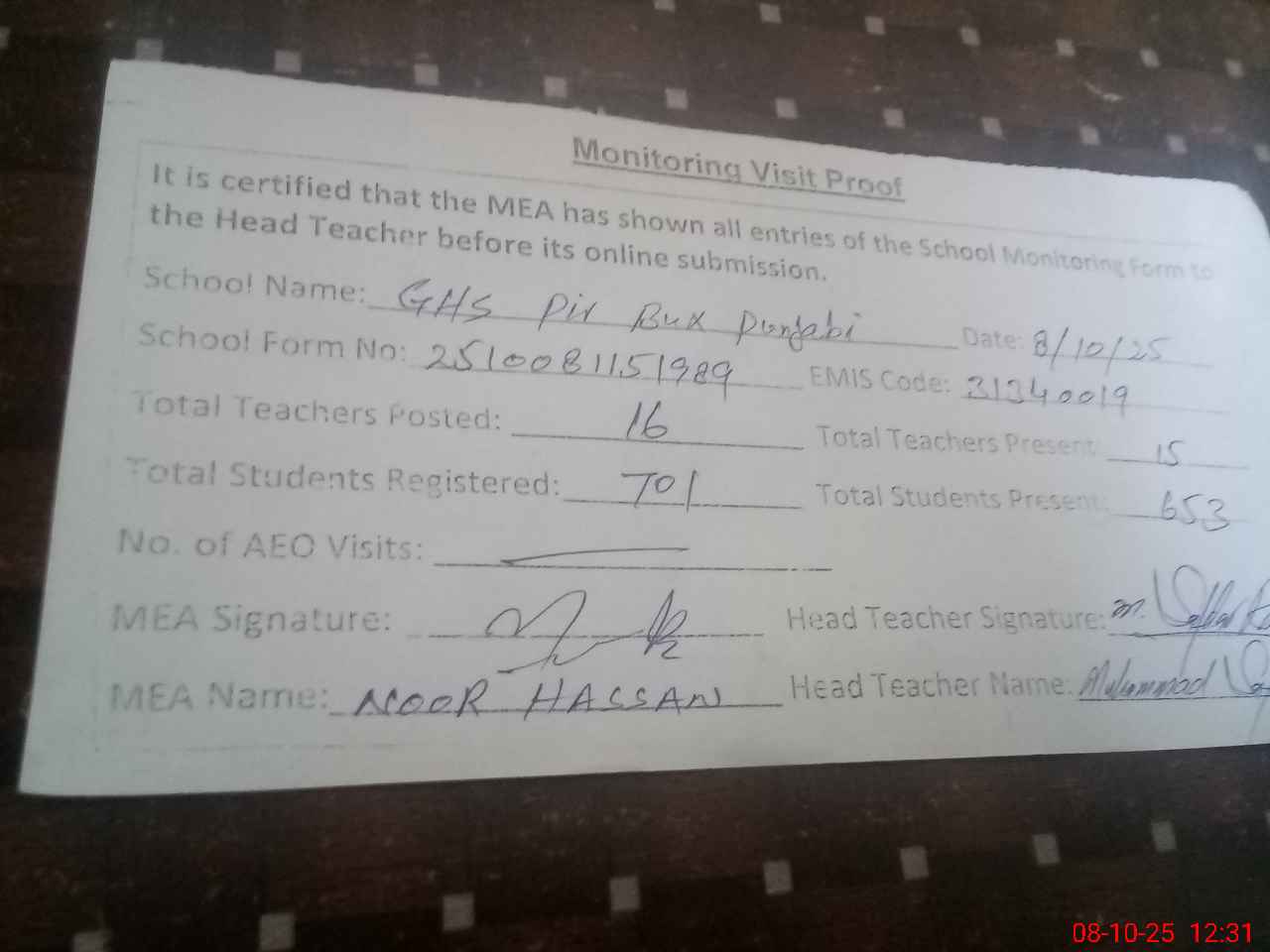| Attendance Register | Head Teacher | MEA with School | Visit Proof |