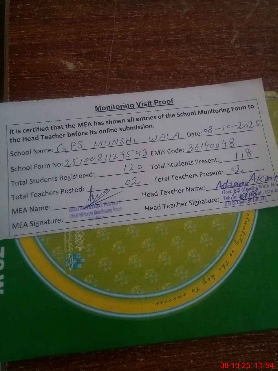 | Attendance Register | Head Teacher | MEA with School | Visit Proof |