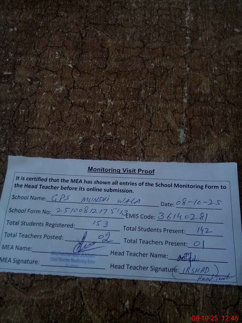| Attendance Register | Head Teacher | MEA with School | Visit Proof |