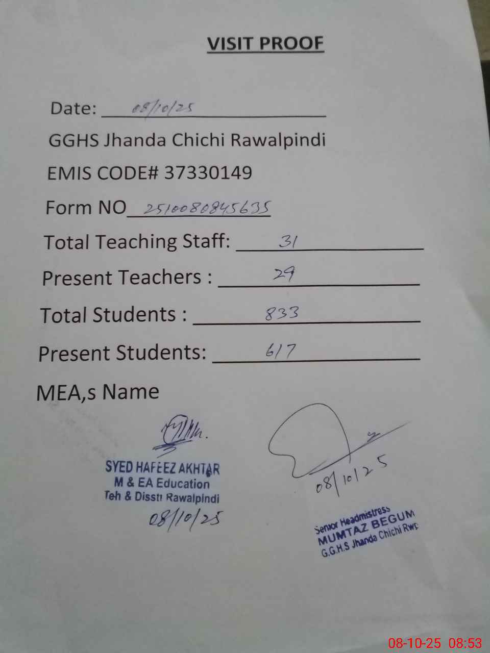 | Attendance Register | Head Teacher | MEA with School | Visit Proof |