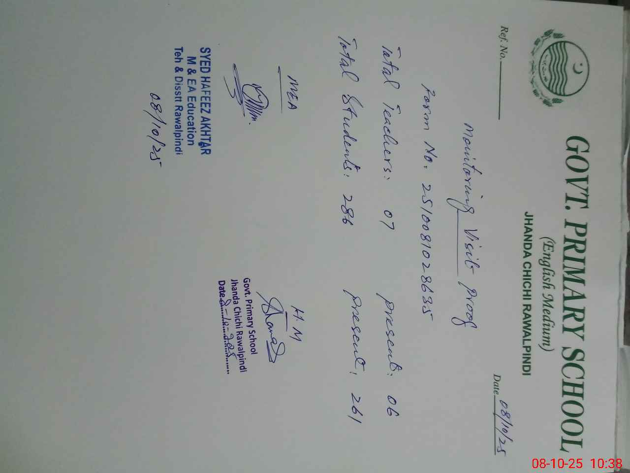 | Remarks (Use Separate Page if Required): Teacher Abdul Hannan Shahid PST marked as on Dengue duty in attendance register while no letter available in school so I marked him as un authorised absent N Qasid Muhammad Fayyaz marked as on official duty in DDEO office in attendance register while no letter available in school so I marked him as un authorised absent NSB record not updated in pmiu app Students of class 3 listed in pmiu app are not updated All students have left school after promotion from class 5 | |||||