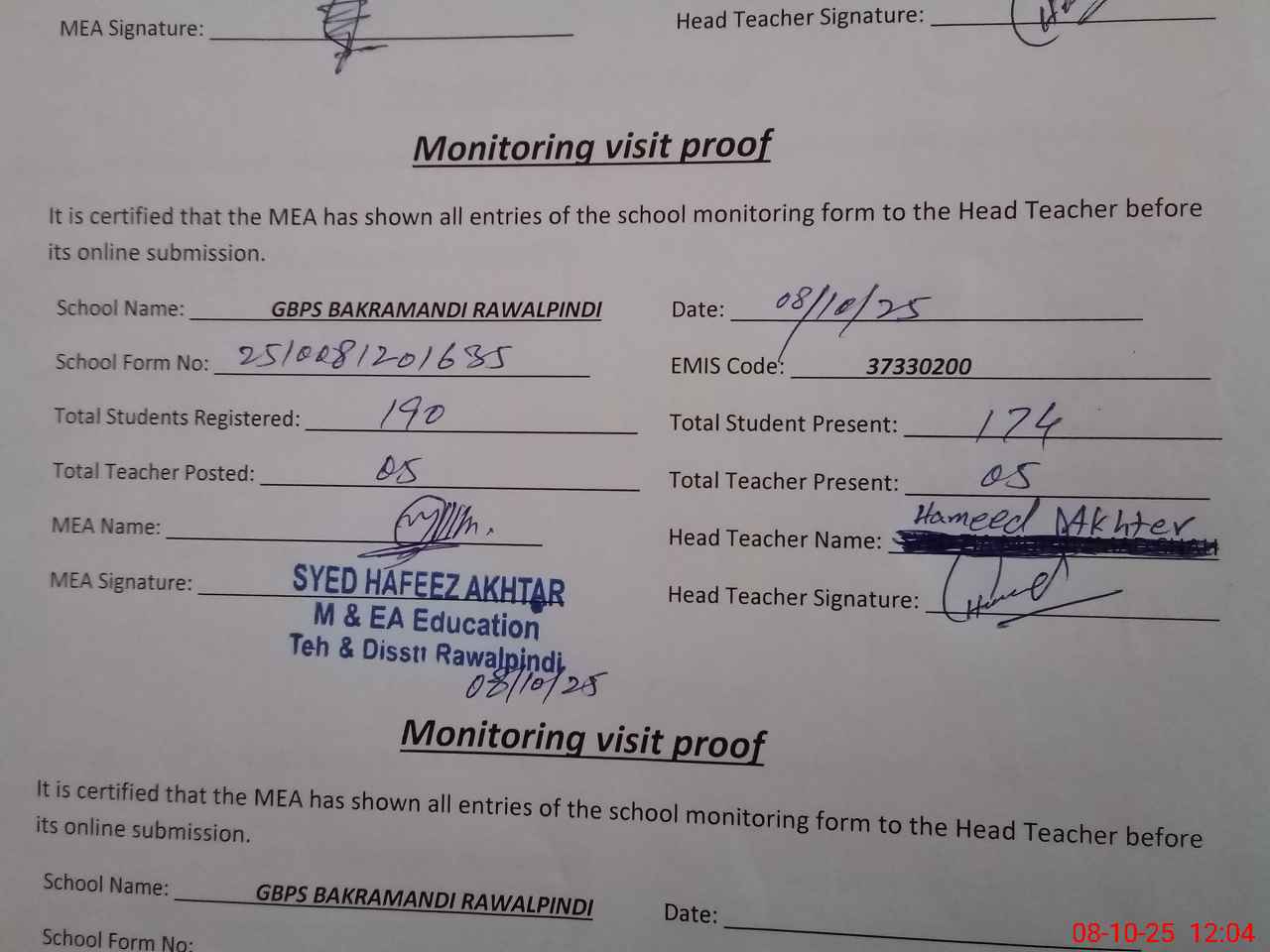 | Monitoring Date: 08-10-2025 | Start Time: 08-10-2025 11:51 AM | End Time: 08-10-2025 12:20 PM | Name of MEA: Sy**** Ha**** Ak**** | |
