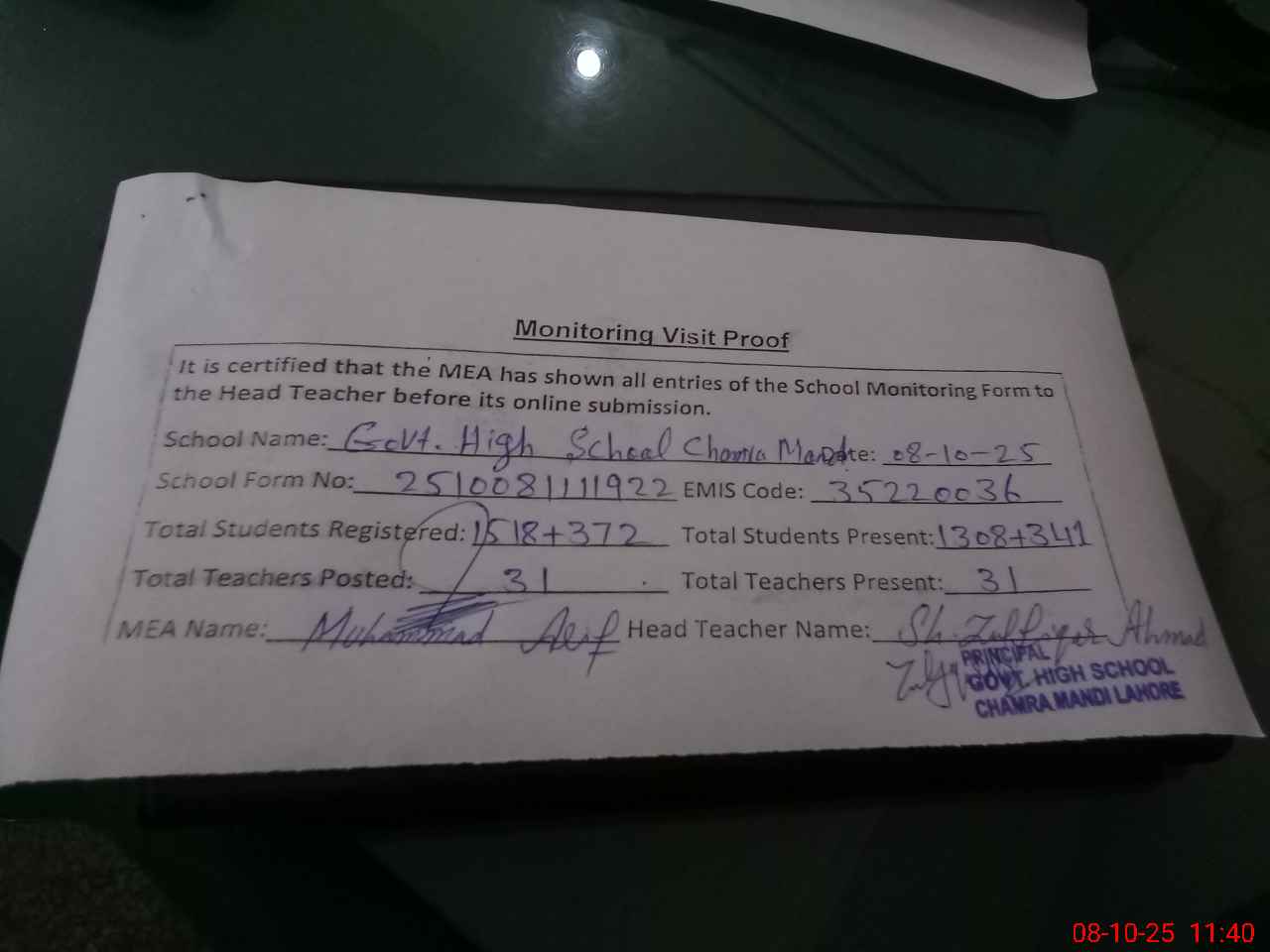 | Certified that this School was Inspected by the Undersigned MEA/DMO Today and the Information Stated Above is as Per Record. | |||||