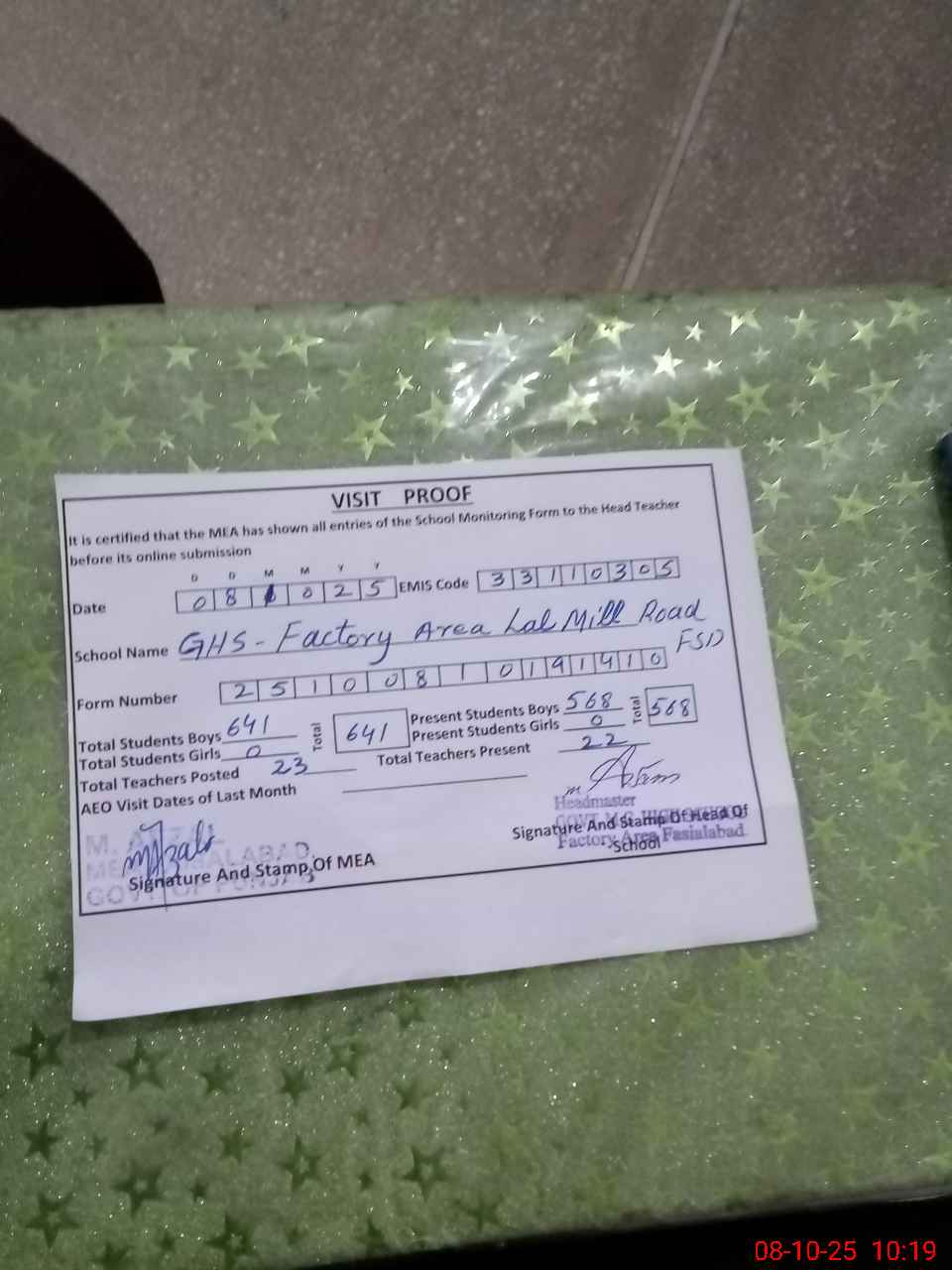 | Certified that this School was Inspected by the Undersigned MEA/DMO Today and the Information Stated Above is as Per Record. | |||||