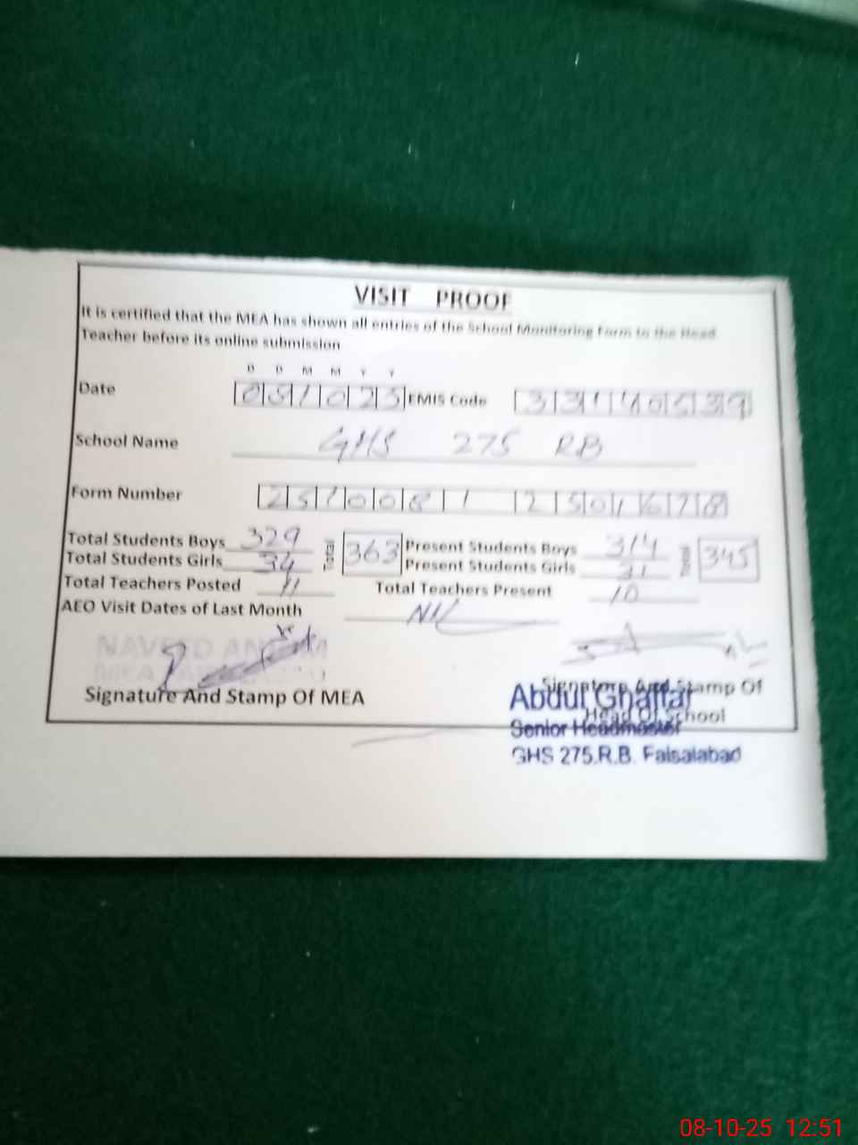 | Certified that this School was Inspected by the Undersigned MEA/DMO Today and the Information Stated Above is as Per Record. | |||||