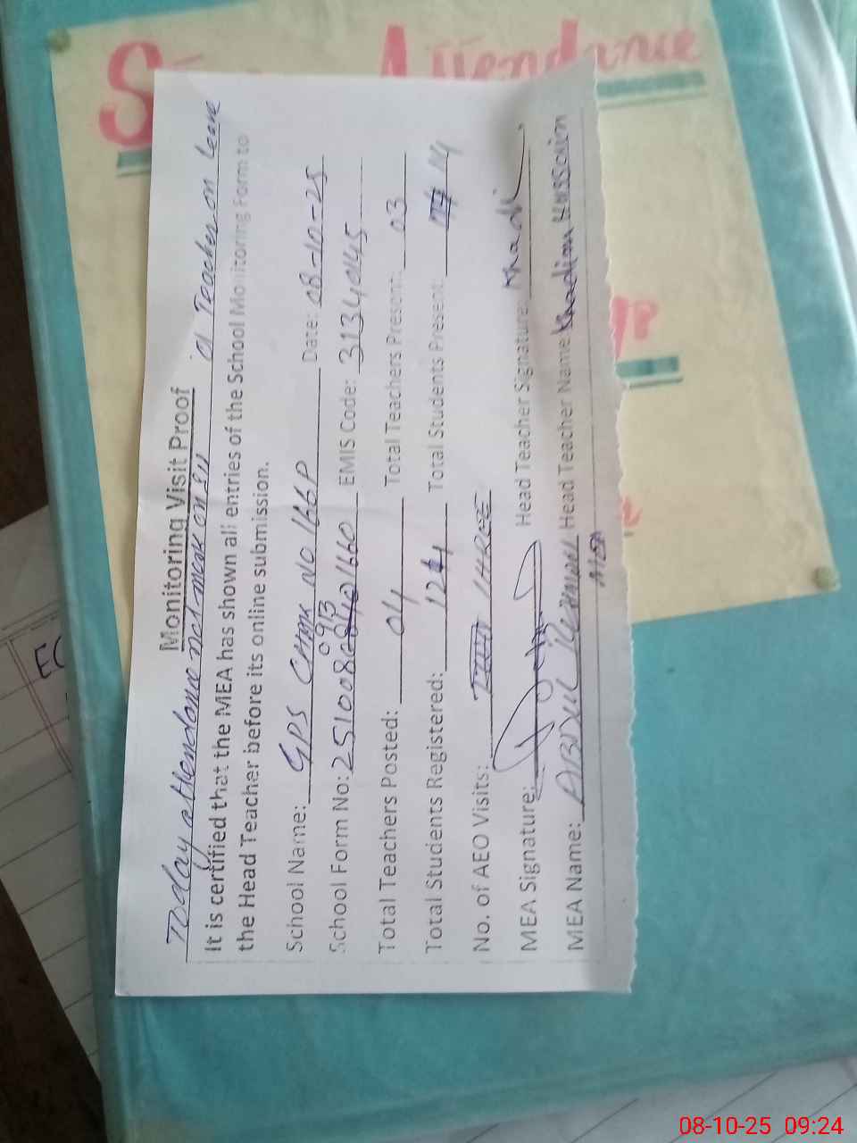 | Attendance Register | Head Teacher | MEA with School | Visit Proof |