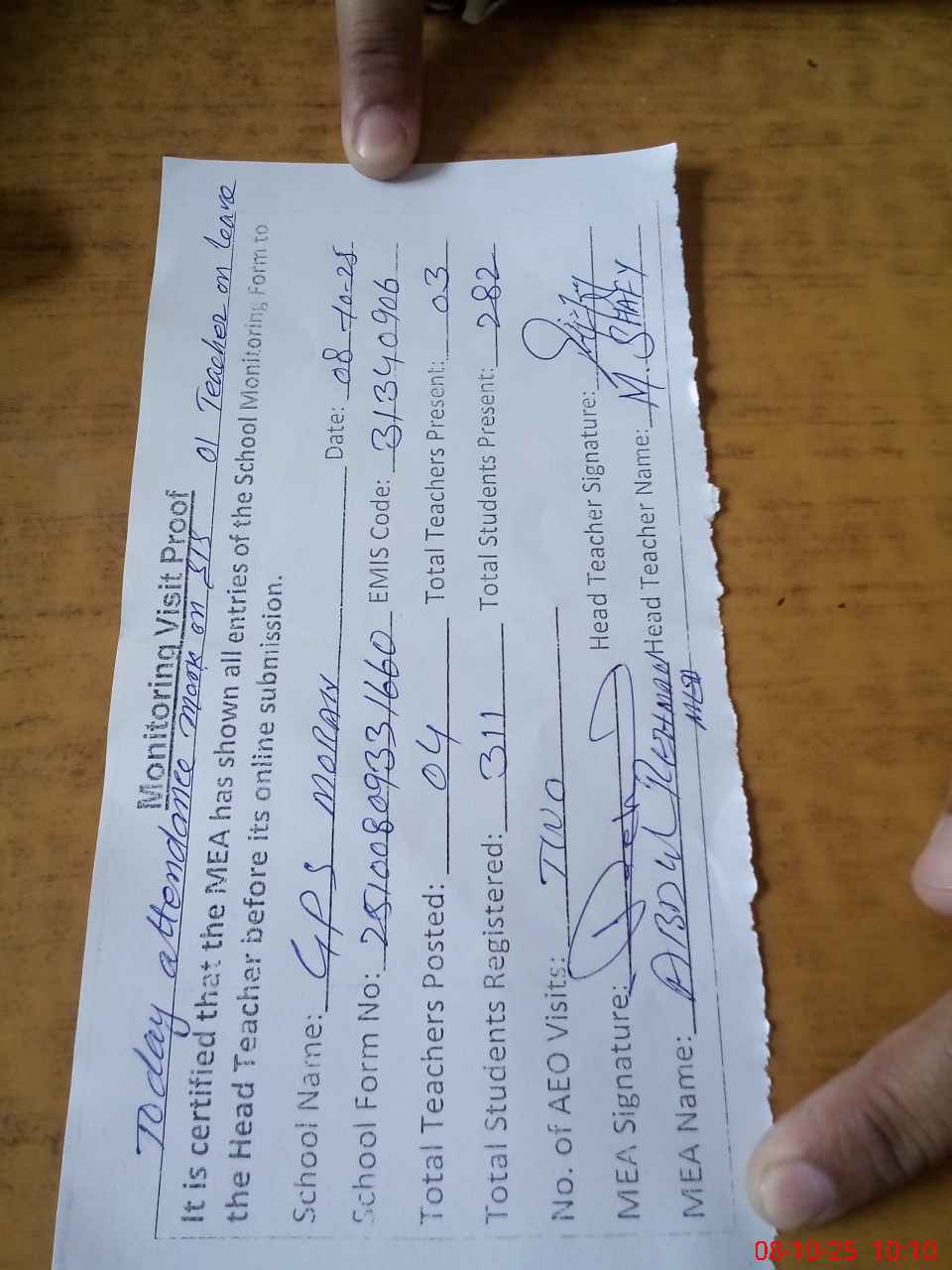 | Attendance Register | Head Teacher | MEA with School | Visit Proof |